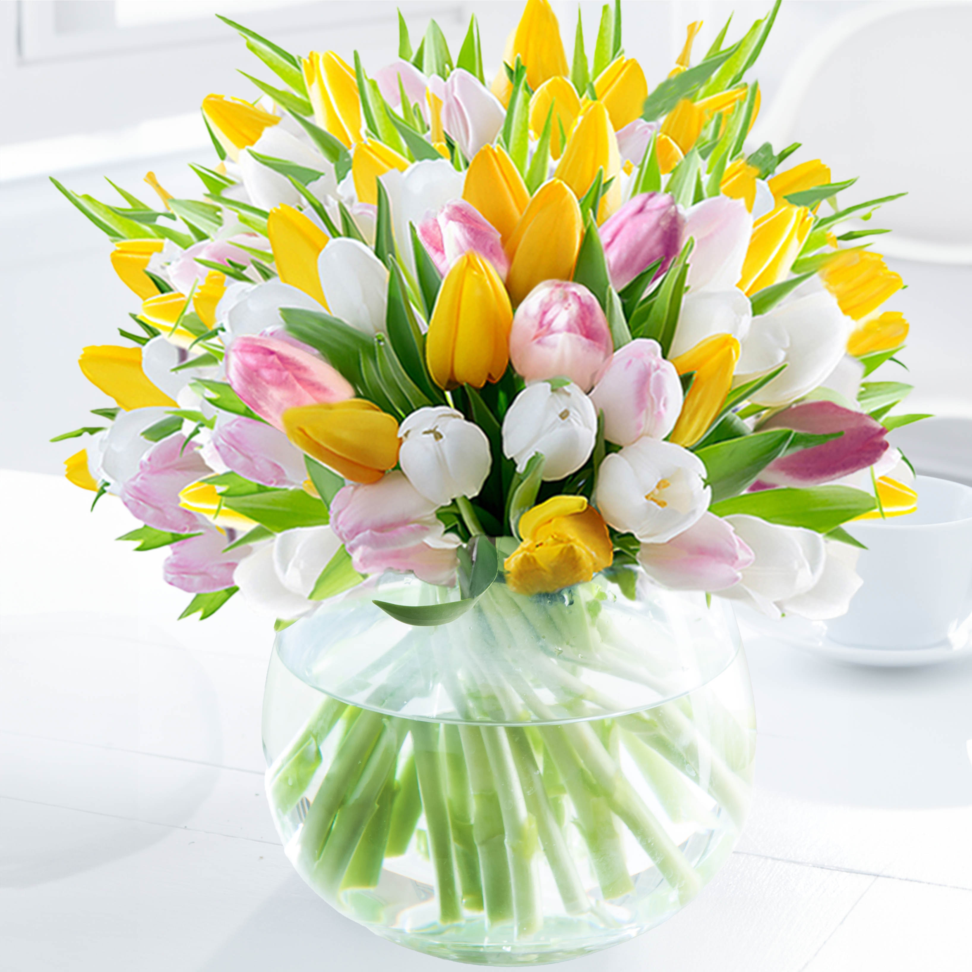 Make someone smile this spring with this stunning collection of 100 bright and cheerful tulips in pink, white, and yellow. The perfect pick me up!