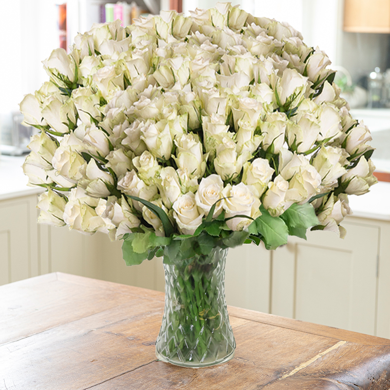 A beautifully elegant gift of 100 white roses, perfect for any special occasion. Roses can appear to have a green tint around the outer petals but, as the flower head opens, will turn a pure white colour.