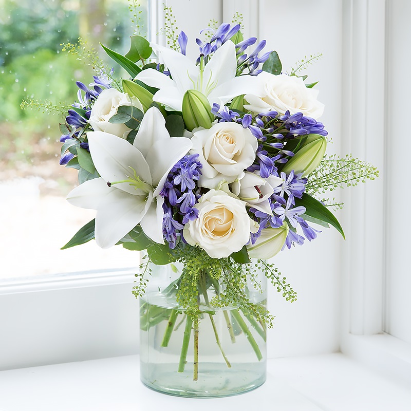 A delicate bouquet of blue agapanthus with white oriental lilies and large white roses.