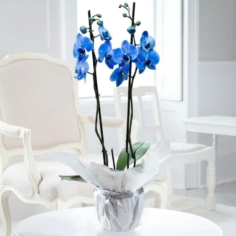 An elegant gift of a stunning twin stemmed vibrant blue phalaenopsis orchid plant beautifully presented in gift wrapping. Perfect as a gift for all occations present.Please note, orchid shades can vary in colour