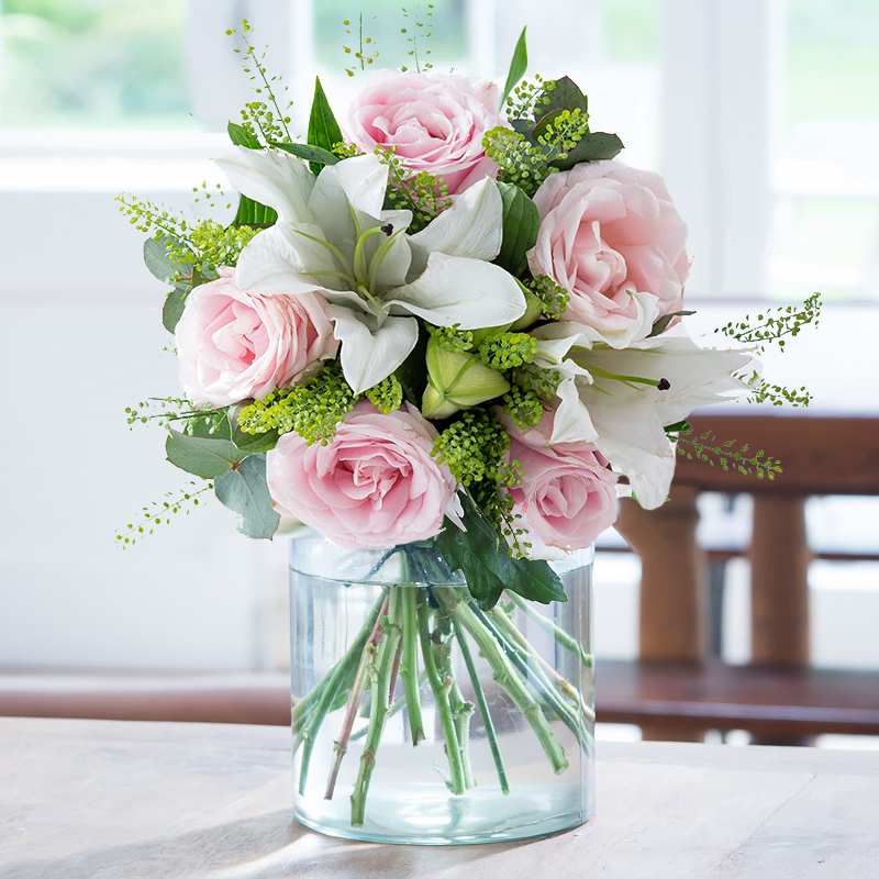 This beautiful bouquet of hand-tied flowers is a floral delight of pretty pink Athena roses and heavenly scented white lilies, finished with pretty greenery.