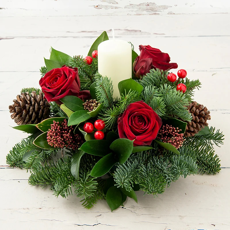 Bring classic festive colour to your Christmas dinner with this beautiful pine table centre decorated with red roses, skimmia, berries, and pinecones. The Table Centre has an approximate length of 20-25cm."