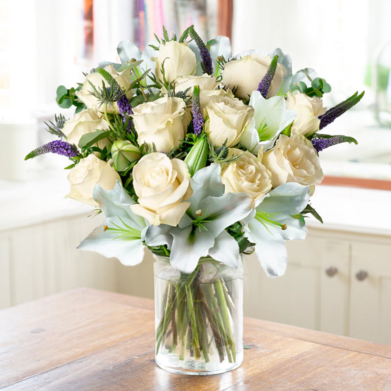 A stunning bouquet of white Athena roses, fragrant lilies, and sky blue veronica.
