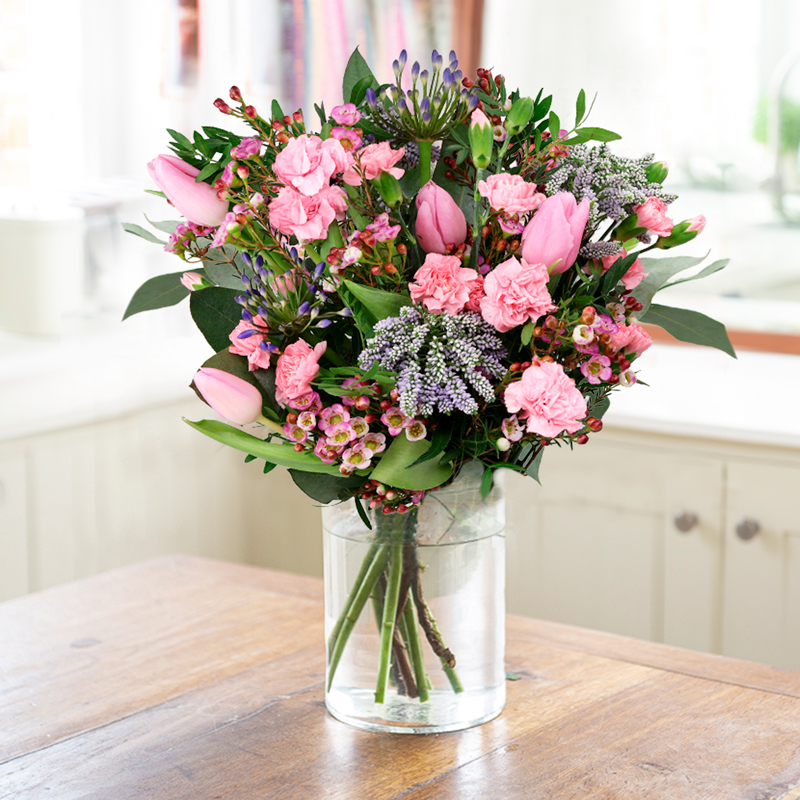 Say Happy Birthday with January's Birth Bouquet. This delightful arrangement of flowers includes pink carnations and pink tulips. The carnation is January's birth flower, and symbolises devotion, love and happiness.