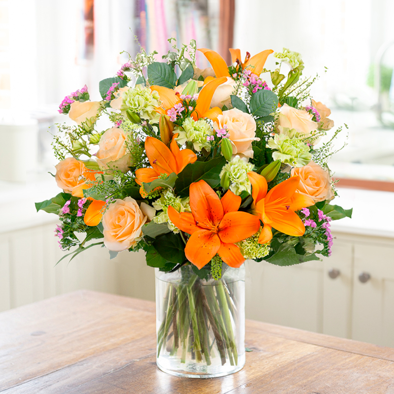 Take a walk in a spring garden with this bouquet full of beautiful peach and Pinkroses and lilies, along with green carnations and pink sweet Williams.