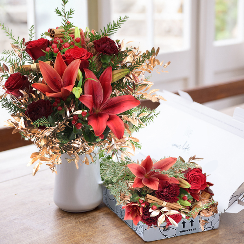 This festive bouquet that captures the warmth of the holiday season, featuring a lush mix of red roses, burgundy carnations, and a striking red lily, accented with golden pistache and pine for a touch of wintry elegance. Finished with cinnamon sticks and vibrant red hypericum, this arrangement is perfect for spreading holiday cheer.