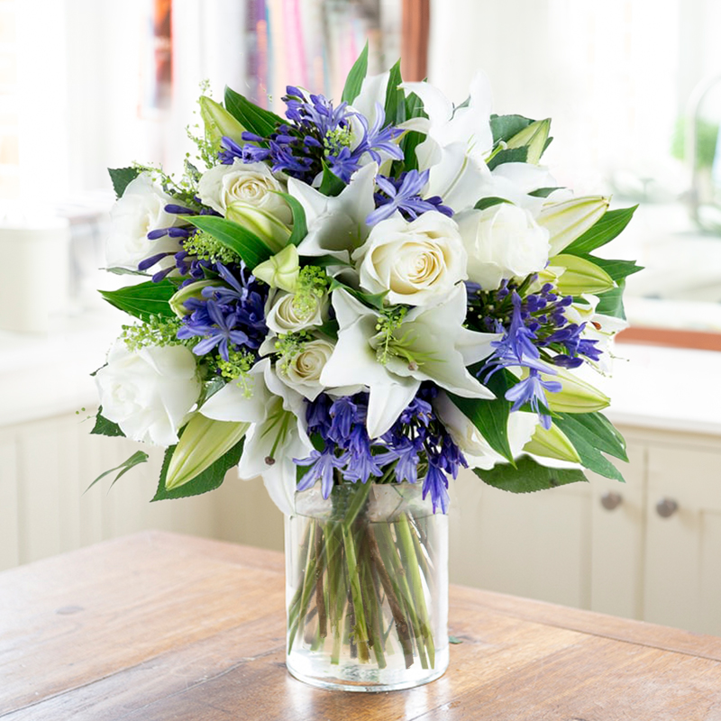 A delicate bouquet of blue agapanthus with white oriental lilies and large white roses.