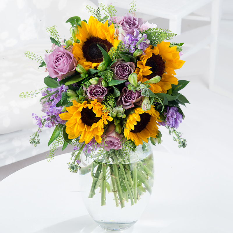 Summer is here with this scented bouquet of lilac stocks, seasonal autumn sunflowers and white alstroemeria.