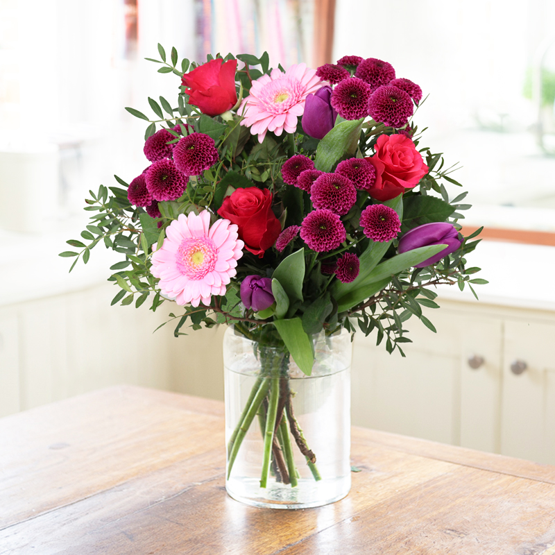 Fall in love with this alluring bouquet of purple tulips, cerise roses, purple santini chrysanthemums, and pale pink germini.