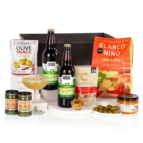 Add a little heat with our A Little Bit of Spice hamper, a bold mix of savoury snacks and spicy treats including Chilli & Garlic Nuts, Harissa Houmous, Chilli & Lime Tortilla Chips, Mango Margarita and North Bank Lager. Perfect for spice lovers. This hamper contains 6 items: Blanco Nino Chilli & Lime Tortilla Chips 170g Cambrook Extraordinary Chilli & Garlic Mixed Nuts with Corn 65g Mr Filbert's Chili & Black Pepper Olives 50g Odysea Harissa Houmous 265g Gather Spicy Mango Margarita 150ml 12.2% vol x 2 Great Newsome North Bank Lager 500ml 4.5% vol x 2 Packed in black kraft tray.