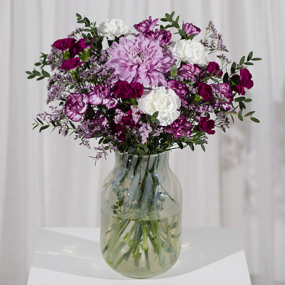 A dreamy display of blooms in enchanting shades of purple and white, featuring elegant Carnations and delicate Chrysanthemums. The rich magenta and soft lavender tones create a captivating contrast with pristine white blooms, while lush green foliage adds depth and texture.