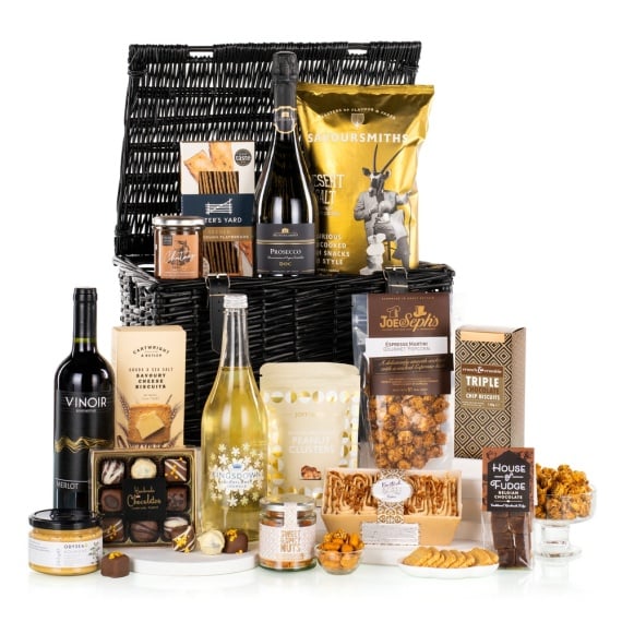 A truly show-stopping hamper, The Extravagance combines fine wines, Prosecco and Elderflower Sparkle with gourmet savoury treats and indulgent sweets. Beautifully presented in a black lidded wicker basket, it’s the ultimate luxury gift for any grand occasion. This hamper contains 15 items: British Bakes & Cakes Toffee Loaf Cake 290g Cambrook Sweet & Spicy Nut Mix 75g Cartwright & Butler Gouda & Sea Salt Savoury Cheese Biscuits 75g Crunch & Crumble Triple Chocolate Biscuits 150g Highfield Preserves Real Ale Chutney 215g House of Fudge Belgian Chocolate Fudge 100g Joe & Seph's Espresso Martini Popcorn 70g Joypouch Peanut Clusters 100g Kingsdown Elderflower Sparkle 750ml Linden Lady 9 Assorted Chocolates 110g Odysea Houmous 265g Peter's Yard Seeded Flatbreads 135g Savoursmiths Desert Salt Crisps 150g Prosecco DOC Montecampo Italy 75cl 10.5% vol Merlot Vinoir Chile 75cl 12.5% vol Packed in black traditional lidded hamper.