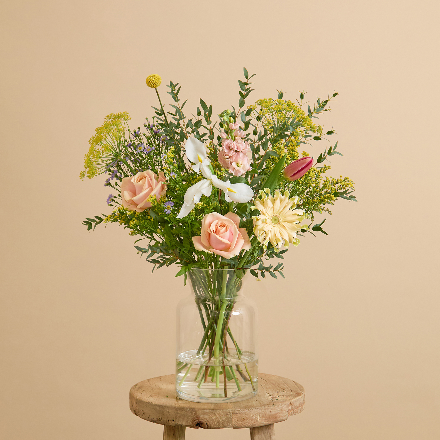 Beautiful, hand-picked, unique and unusual fresh flowers delivered direct tomorrow (next day) or set date (free). We even deliver on Sunday. Order before 8pm for your flowers to arrive tomorrow, or choose a set date. Available as as a subscription gift too. Amazing 5* reviews and 1,000s of happy customers. The soft murmurs of sprouting and growing gather in the meadow as it rises from its slumber. Salmon-pink tulips and roses welcome the shift into spring in a valley of solidago and fragrant dill. Among the swaying foliage, heads pop up, one after the other: a white iris, a pastel-pink stock, and a yellow pair of craspedia and gerbera.