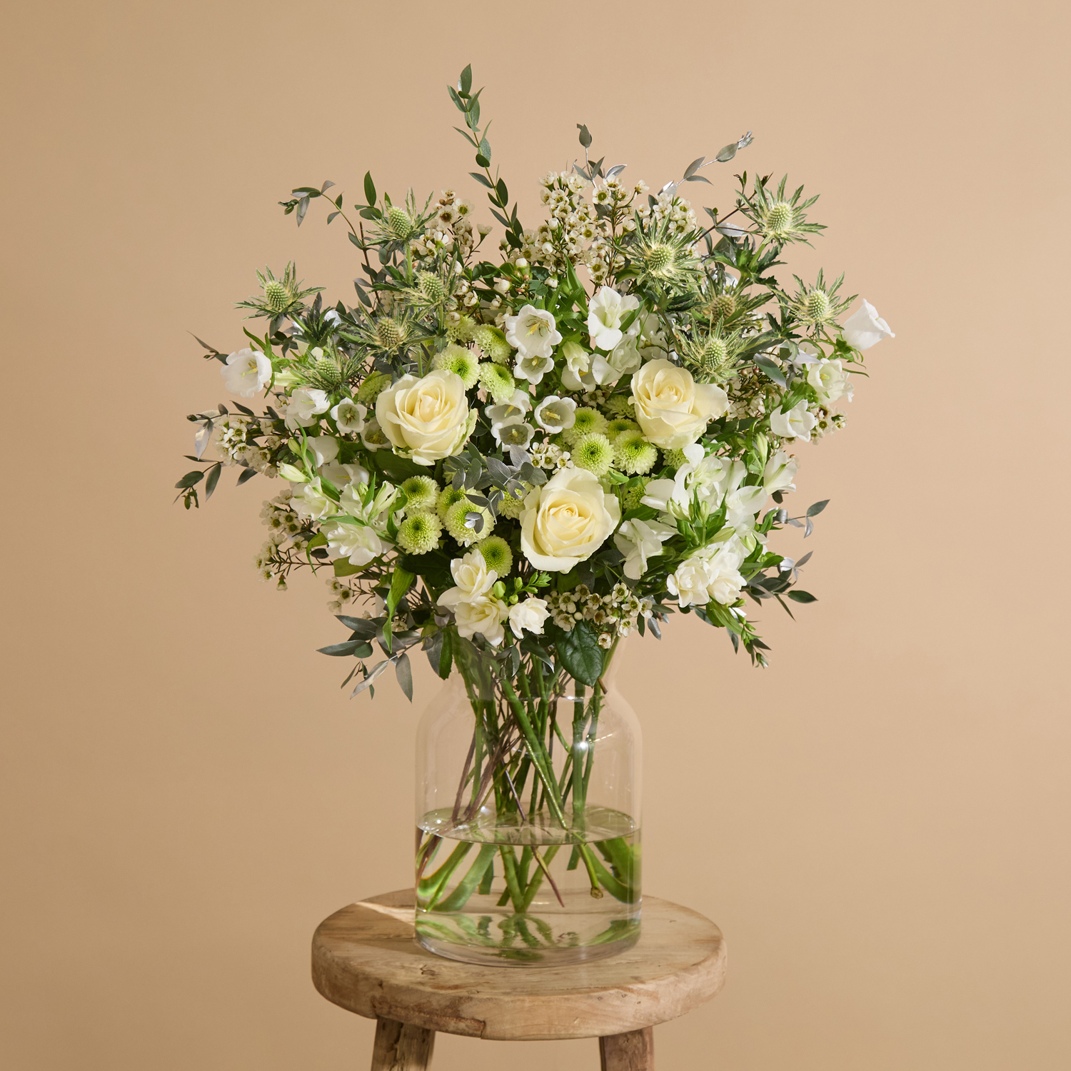 Beautiful, hand-picked, unique and unusual fresh flowers delivered direct tomorrow (next day) or set date (free). We even deliver on Sunday. Order before 8pm for your flowers to arrive tomorrow, or choose a set date. Available as as a subscription gift too. Amazing 5* reviews and 1,000s of happy customers. A bunch inspired by the stillness of a winter’s evening with sculptural brassica unfurling in shades of purple, its velvety tones setting the scene like twilight. Pure white roses bring a luminous glow, while delicate alstroemeria add subtle detail. Sprigs of eucalyptus weave through, giving freshness and lift, like a cool evening breeze.