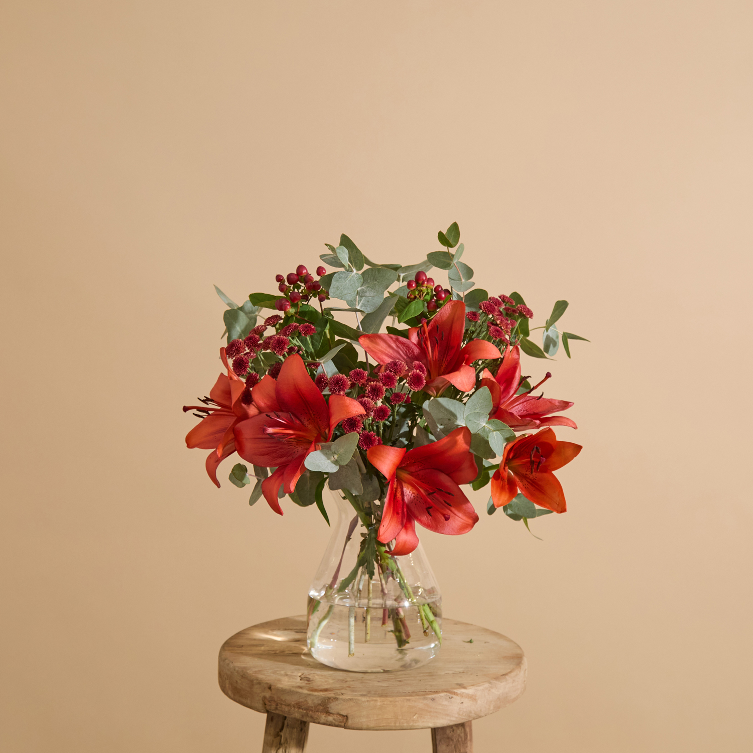 Beautiful, hand-picked, unique and unusual fresh flowers delivered direct tomorrow (next day) or set date (free). We even deliver on Sunday. Order before 8pm for your flowers to arrive tomorrow, or choose a set date. Available as as a subscription gift too. Amazing 5* reviews and 1,000s of happy customers. Inspired by the sumptuous texture of your fanciest pyjamas, we've chosen luxe and lacquered ruby tones to bring something extra special to an evening spent at home. We've added LA lilies, eucalyptus and berried hypericum, ready to pair with dinner for two or a night in your duvet.