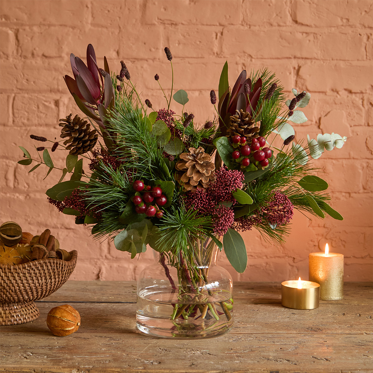 Send unique, festive Christmas flowers, hand-picked and beautifully arranged to bring holiday cheer. Order before 8pm for next-day delivery, or choose free standard delivery. Sunday delivery available too! Perfect for gifts, holiday décor, or Christmas celebrations. Loved by thousands of happy customers with 5-star reviews for quality and service. All your festive favourites, in one place. Scented eucalyptus, rich pine and fragrant greenery come together with berried hypericum and pinecones for a look that’s timeless, classic and joyfully merry. Like the feeling of driving home for Christmas or wrapping your gifts with love, full of scent and seasonal cheer.