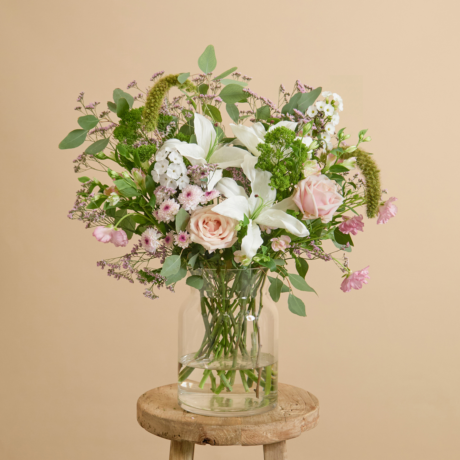 Perfect for Easter | Beautiful, hand-picked, unique and unusual fresh flowers delivered direct tomorrow (next day) or set date (free). We even deliver on Sunday. Order before 8pm for your flowers to arrive tomorrow, or choose a set date. Available as as a subscription gift too. Amazing 5* reviews and 1,000s of happy customers. A gentle breeze carries with it the rustling of leaves in the trees and the chirping of birds. This arrangement is a spring awakening in a pale pink canopy of butterfly ranunculus, and roses. White lilies, violet phlox, and spray chrysanthemums sit softly in a treetop nest of limonium, eucalyptus, and lush green trachelium, while setaria grass sways in the wind.