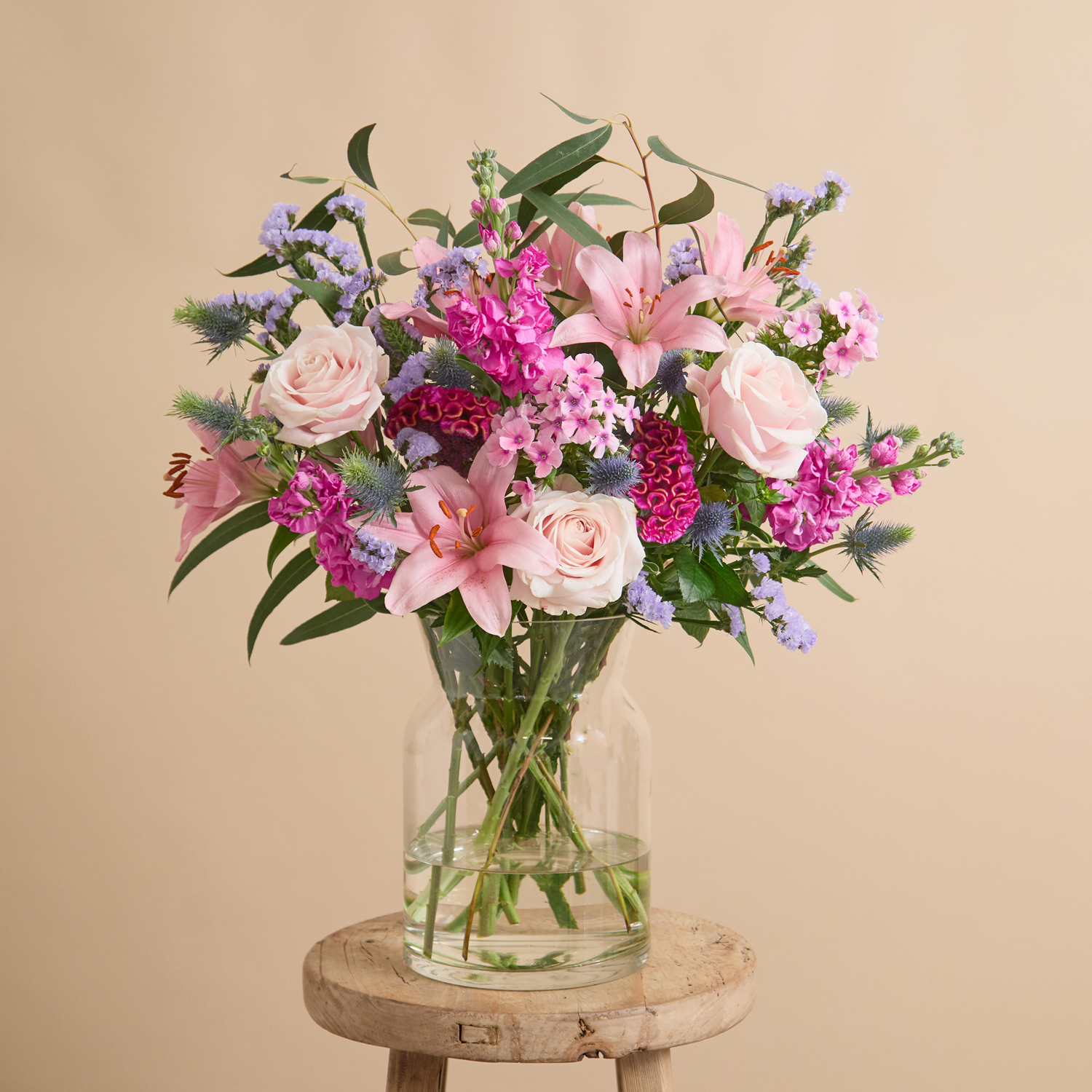 Beautiful, hand-picked, unique and unusual fresh flowers delivered direct tomorrow (next day) or set date (free). We even deliver on Sunday. Order before 8pm for your flowers to arrive tomorrow, or choose a set date. Available as as a subscription gift too. Amazing 5* reviews and 1,000s of happy customers. Bold and lively, this arrangement showcases a vibrant spectrum of magenta shades for an energising burst of colour. A gradient of light pastel Avalanche roses and phlox into pink LA lilies and saturated cerise stocks unfurls against earthy eucalyptus. Pops of velvet-red celosia, blue eryngium, and Milka statice add playful contrast and texture.