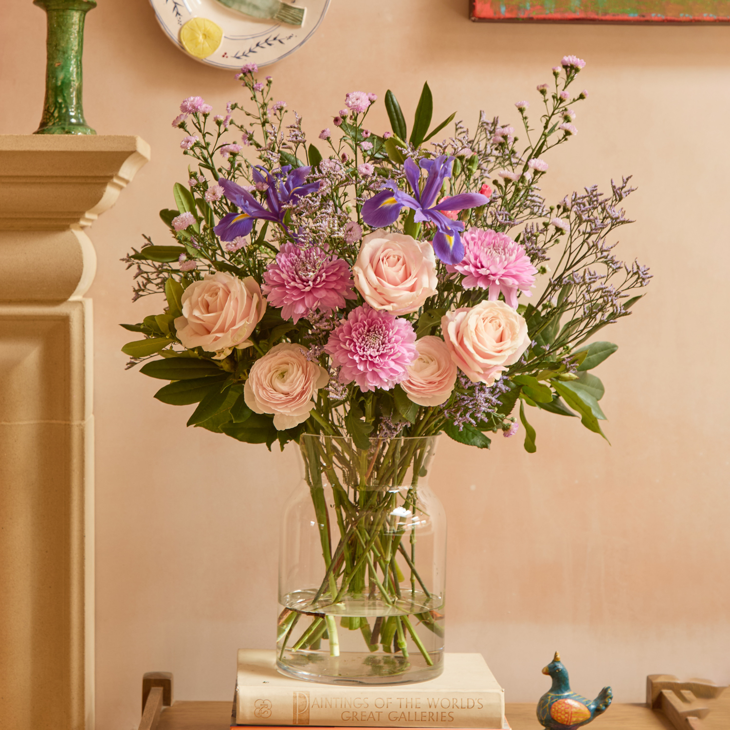 Beautiful, hand-picked, unique and unusual fresh flowers delivered direct tomorrow (next day) or set date (free). We even deliver on Sunday. Order before 8pm for your flowers to arrive tomorrow, or choose a set date. Available as as a subscription gift too. Amazing 5* reviews and 1,000s of happy customers. Your Sunday breakfast - pancakes sizzling in a copper pan, blueberries from the garden, and an embroidered tablecloth. Blue irises, pink chrysanthemums and spray carnations add notes of sweetness, while purple and lilac drizzles of asters and limonium hark back to something that holds sentimental value and brings comfort. Topped with Sweet Avalanche roses and ranunculus, this arrangement captures the taste of home.