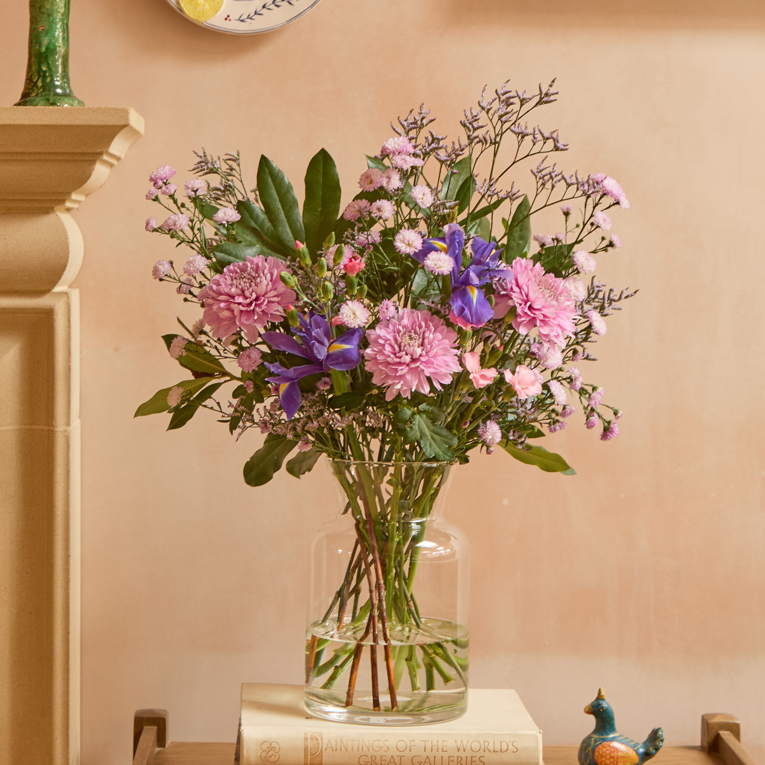 Beautiful, hand-picked, unique and unusual fresh flowers delivered direct tomorrow (next day) or set date (free). We even deliver on Sunday. Order before 8pm for your flowers to arrive tomorrow, or choose a set date. Available as as a subscription gift too. Amazing 5* reviews and 1,000s of happy customers. Your Sunday breakfast - pancakes sizzling in a copper pan, blueberries from the garden, and an embroidered tablecloth. Blue irises, pink chrysanthemums and spray carnations add notes of sweetness, while purple and lilac drizzles of asters and limonium hark back to something that holds sentimental value and brings comfort. Perhaps it’s simply the taste of home.
