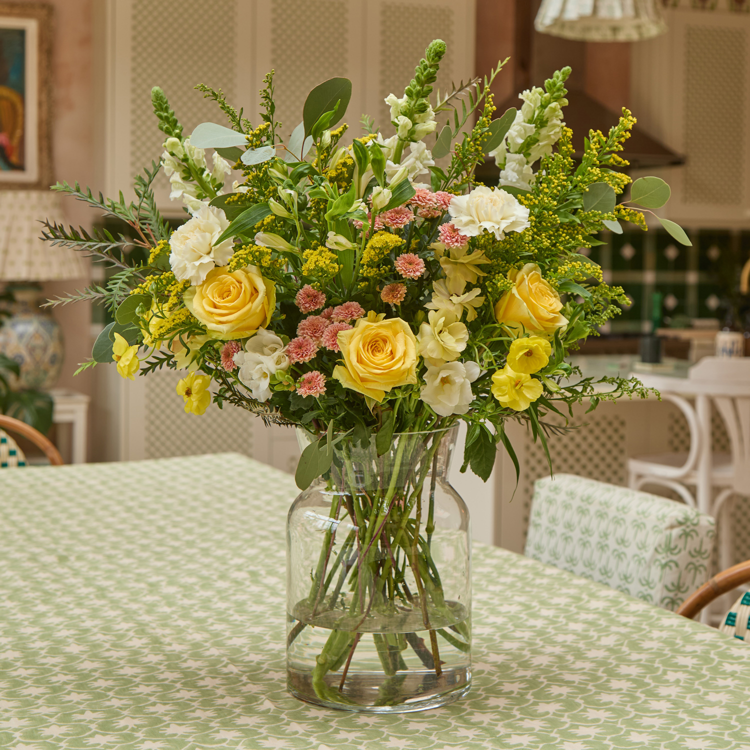 Beautiful, hand-picked, unique and unusual fresh flowers delivered direct tomorrow (next day) or set date (free). We even deliver on Sunday. Order before 8pm for your flowers to arrive tomorrow, or choose a set date. Available as as a subscription gift too. Amazing 5* reviews and 1,000s of happy customers. This arrangement is a delicious pairing of golden hues, like slightly melted butter and apricot marmalade on a fresh slice of toast. Alstroemeria, santinis, and snapdragons add peachy and yellow swirls through a nest of sunny solidago and eucalyptus, topped with white freesias. Creamy Butterfly ranunculus and Pasta Carbonara gerbera evoke a gentle warmth, simple pleasures, and a taste that takes you back to the days of your childhood.