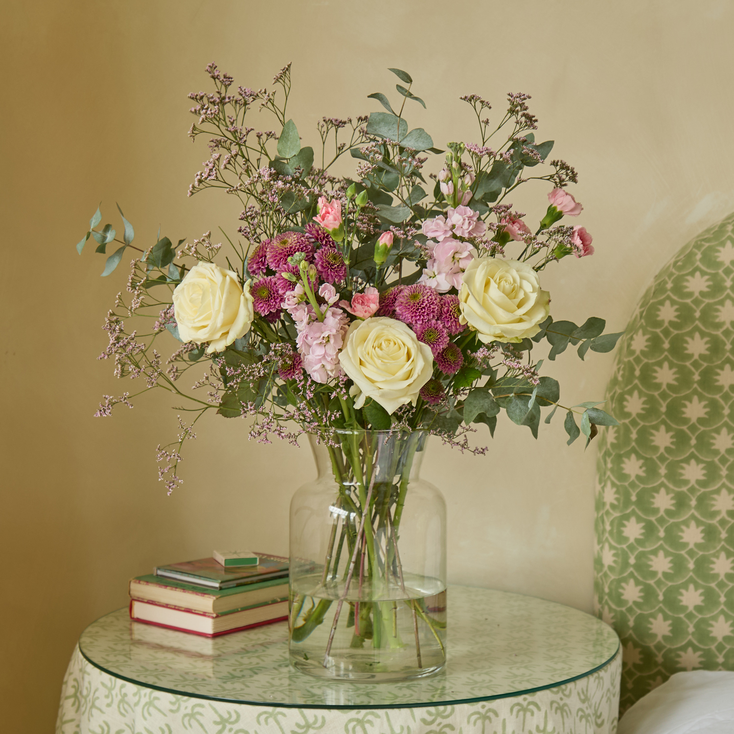 Perfect gift for Mother's Day | Beautiful, hand-picked, unique and unusual fresh flowers delivered direct tomorrow (next day) or set date (free). We even deliver on Sunday. Order before 8pm for your flowers to arrive tomorrow, or choose a set date. Available as as a subscription gift too. Amazing 5* reviews and 1,000s of happy customers. For the slow mornings in your kitchen; steam rising from the kettle and soft light pouring through rosy, gingham-curtained windows like milk into a glass. This pattern weaves through the arrangement as Doria dark santinis intertwine with white roses and spray carnations against lacy limonium and sage-green eucalyptus.
