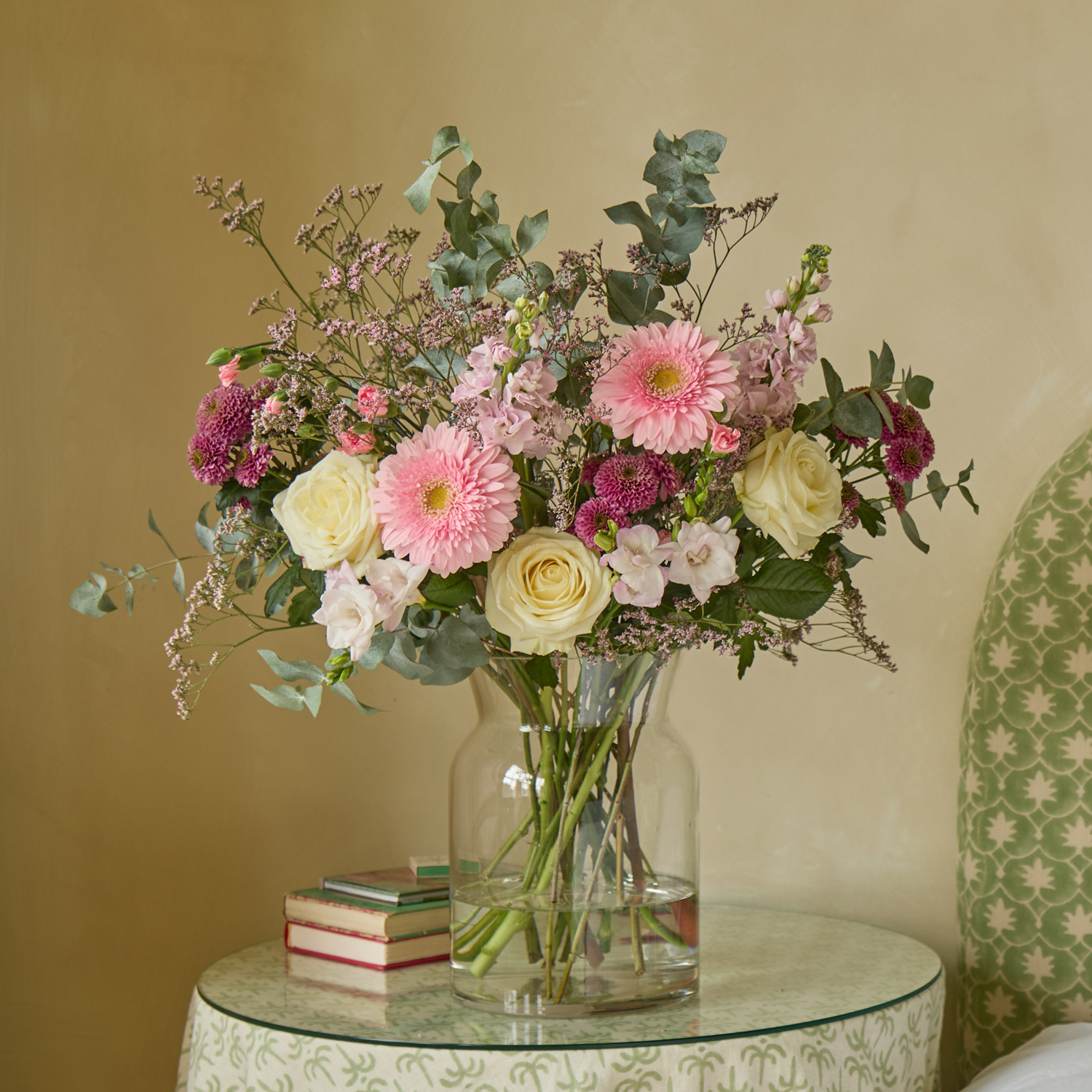 Perfect gift for Mother's Day | Beautiful, hand-picked, unique and unusual fresh flowers delivered direct tomorrow (next day) or set date (free). We even deliver on Sunday. Order before 8pm for your flowers to arrive tomorrow, or choose a set date. Available as as a subscription gift too. Amazing 5* reviews and 1,000s of happy customers. For the slow mornings in your kitchen; steam rising from the kettle and soft light pouring through rosy, gingham-curtained windows like milk into a glass. This pattern weaves through the arrangement as Doria dark santinis intertwine with white roses against lacy limonium and sage-green eucalyptus. Frills of blush-pink stocks and freesias hint at the onset of spring.