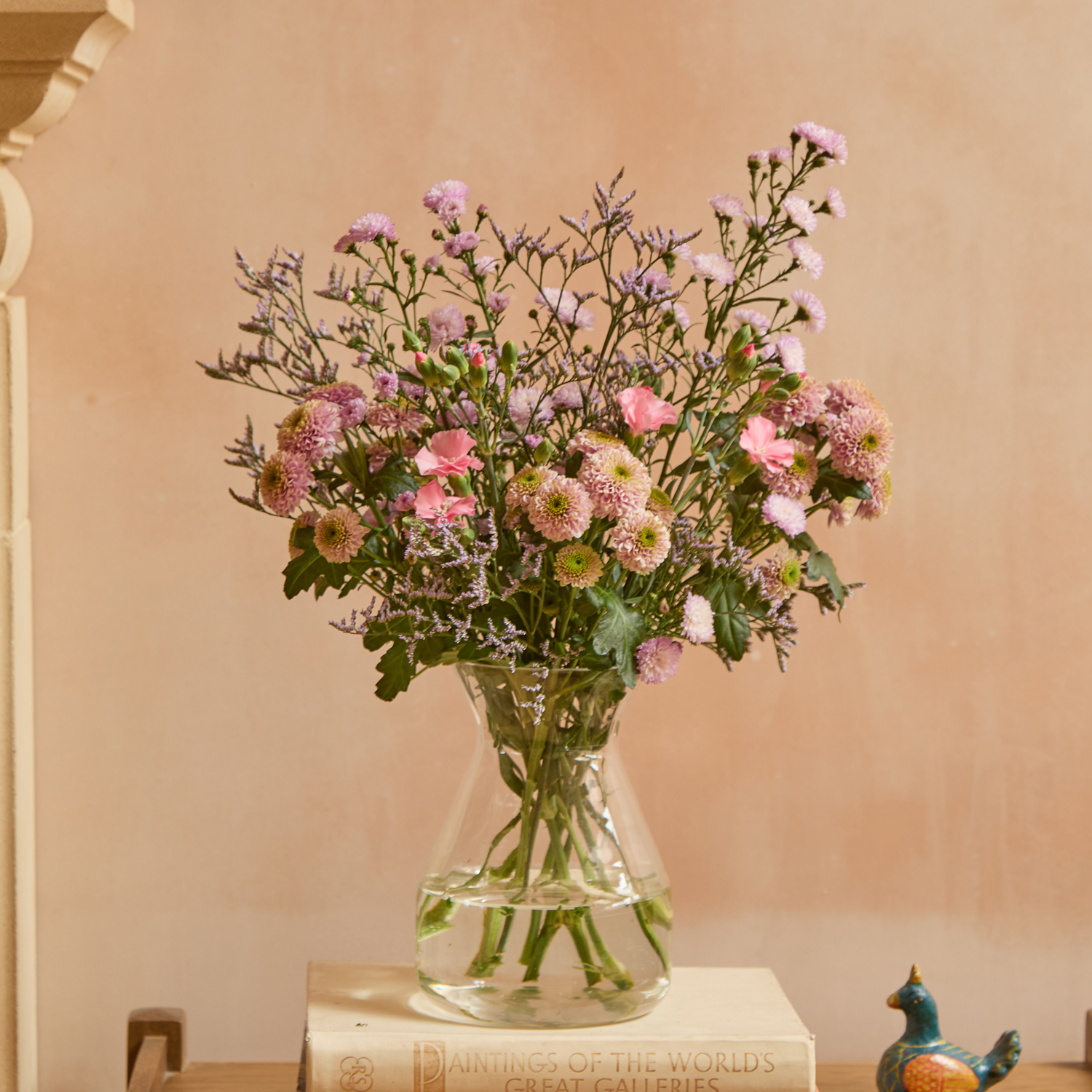 Perfect gift for Mother's Day | Beautiful, hand-picked, unique and unusual fresh flowers delivered direct tomorrow (next day) or set date (free). We even deliver on Sunday. Order before 8pm for your flowers to arrive tomorrow, or choose a set date. Available as as a subscription gift too. Amazing 5* reviews and 1,000s of happy customers. Your Sunday breakfast - pancakes sizzling in a copper pan, blueberries from the garden, and an embroidered tablecloth. Spray carnations with drizzles of Doria Pink santinis, lilac limonium, and Milka asters add sweetness to an arrangement that harks back to something that holds sentimental value and brings comfort; perhaps it’s simply the taste of home.