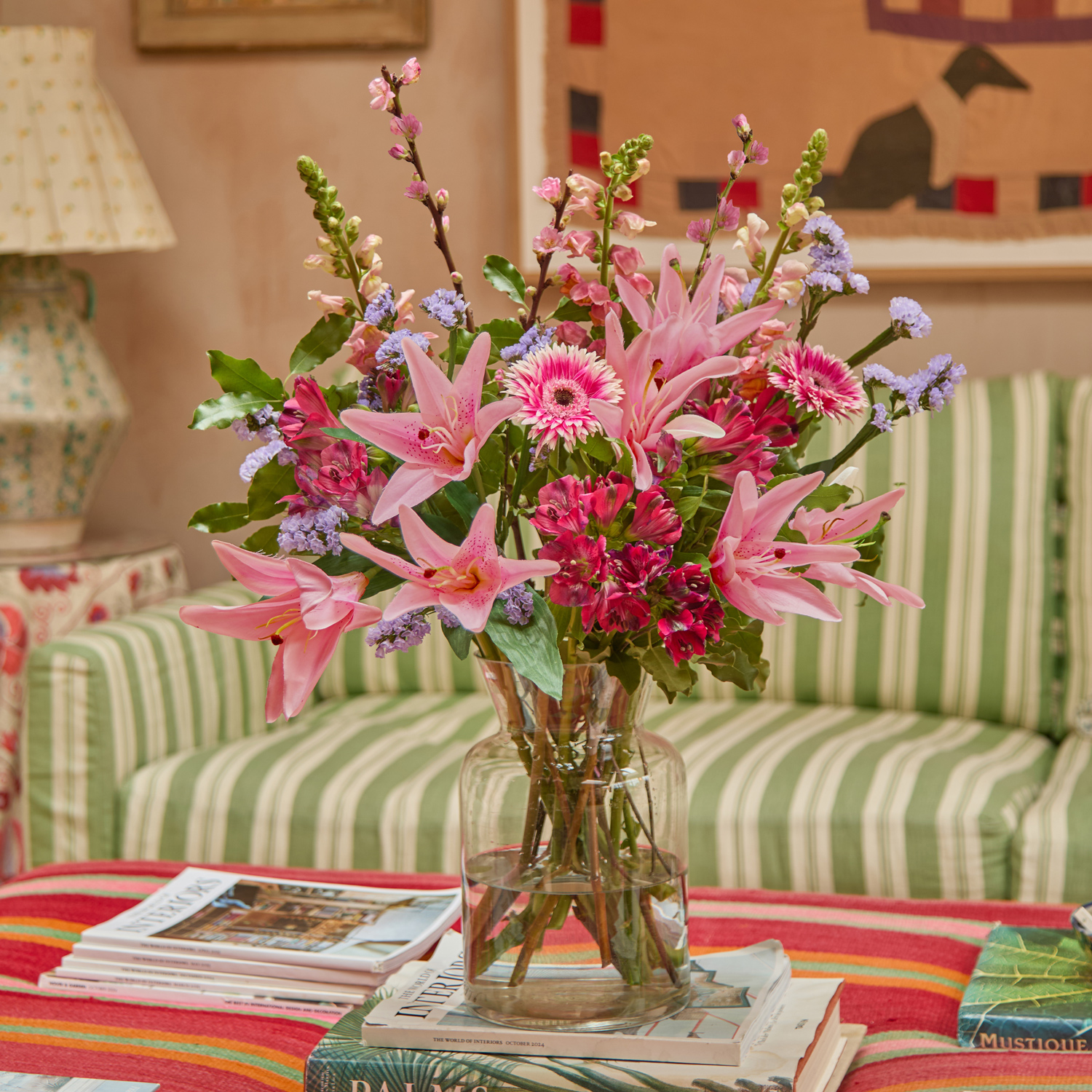 Perfect gift for Mother's Day | Beautiful, hand-picked, unique and unusual fresh flowers delivered direct tomorrow (next day) or set date (free). We even deliver on Sunday. Order before 8pm for your flowers to arrive tomorrow, or choose a set date. Available as as a subscription gift too. Amazing 5* reviews and 1,000s of happy customers. This arrangement evokes sumptuous rhubarb stalks laced over a homemade pie with pink lilies and snapdragons resting on a bed of glistening pittosporum, made even sweeter by Milka statice. Around you, the gentle awakening of spring unfurls softly with Prunus Rancho cherry blossoms. It’s made for all the little moments and your favourite trinkets - an ornamental silver fork, a thrifted decorative plate, and a slice shared over the kitchen counter.
