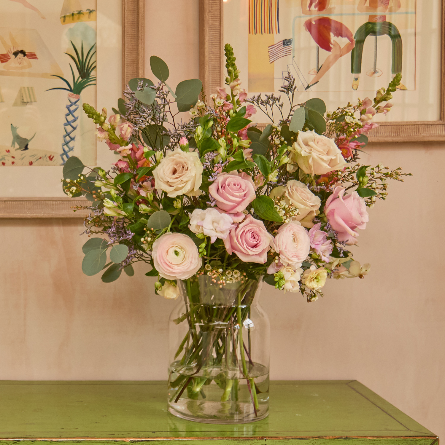 Perfect gift for Mother's Day | Beautiful, hand-picked, unique and unusual fresh flowers delivered direct tomorrow (next day) or set date (free). We even deliver on Sunday. Order before 8pm for your flowers to arrive tomorrow, or choose a set date. Available as as a subscription gift too. Amazing 5* reviews and 1,000s of happy customers. A gentle nod to new beginnings, this arrangement captures the slow awakening of spring, with light pink freesias and snapdragons raising their heads in a nest of silvery eucalyptus and limonium. Secret Garden roses and Butterfly ranunculus catch the glistening morning light as the world around unfolds from its slumber in splendid pastel shades.