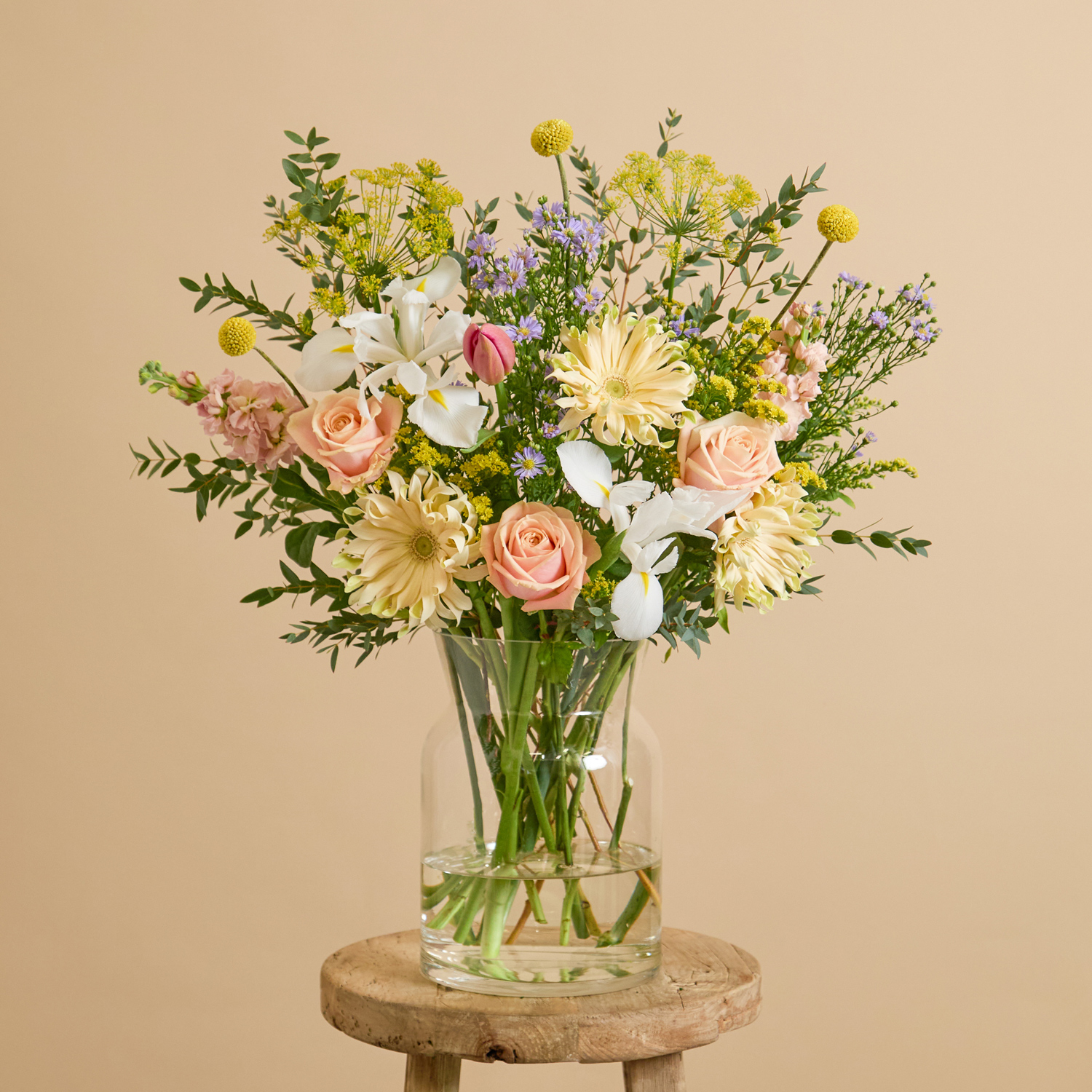 Beautiful, hand-picked, unique and unusual fresh flowers delivered direct tomorrow (next day) or set date (free). We even deliver on Sunday. Order before 8pm for your flowers to arrive tomorrow, or choose a set date. Available as as a subscription gift too. Amazing 5* reviews and 1,000s of happy customers. The soft murmurs of sprouting and growing gather in the meadow as it rises from its slumber. Salmon-pink stocks, tulips, and roses welcome the shift into spring in a valley of solidago and fragrant dill. Among the swaying foliage, life stirs with yellow craspedia and gerberas, lilac asters, and white irises.