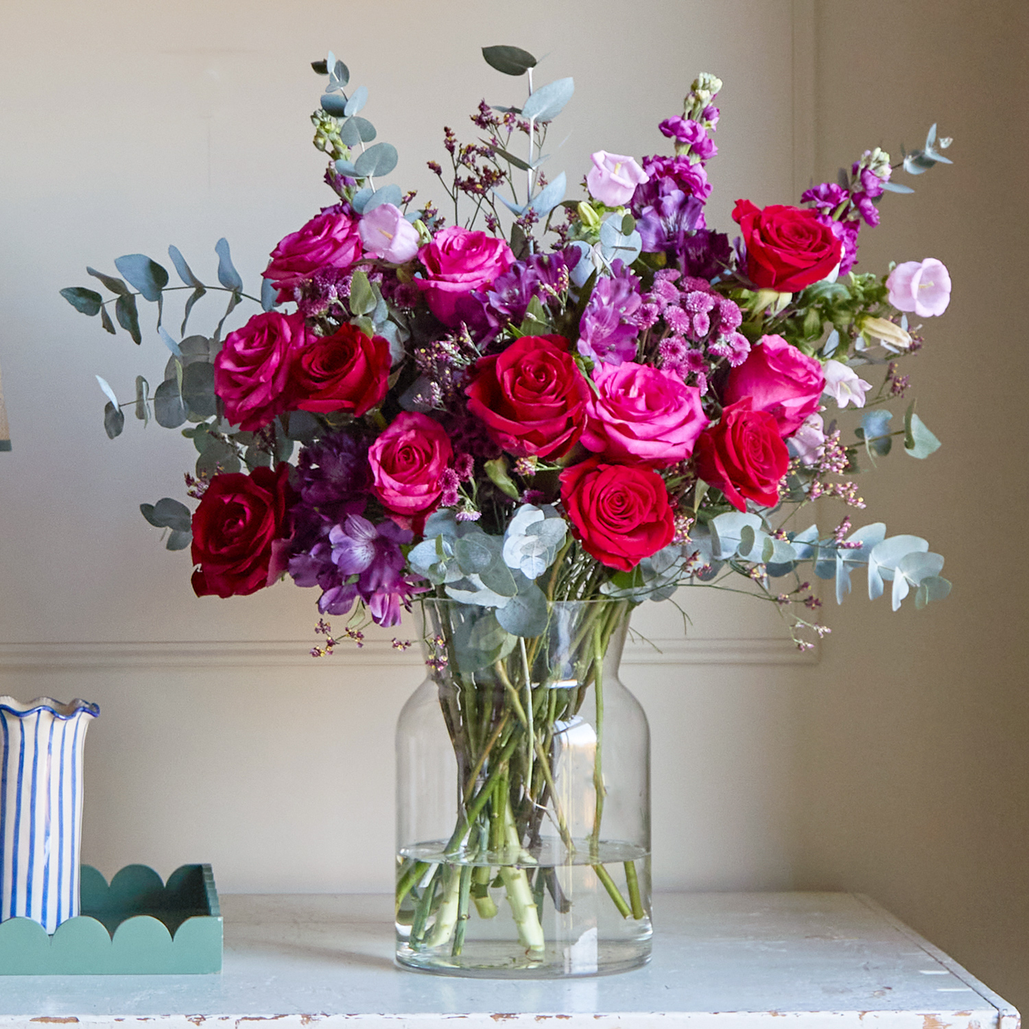 Beautiful, hand-picked, unique and unusual fresh flowers delivered direct tomorrow (next day) or set date (free). We even deliver on Sunday. Order before 8pm for your flowers to arrive tomorrow, or choose a set date. Available as as a subscription gift too. Amazing 5* reviews and 1,000s of happy customers. Welcome a new era with an arrangement that’s playful, sensory, and signals a return to the act of writing and craft - think love notes, letters to friends, and scrapbooking. Bright pops of saturated pinks and reds come together in a dreamscape of billowing roses, santini, campanulas, and snapdragons, set against branched eucalyptus cinerea. Whoever you’re looking to impress, this is the bunch for you.