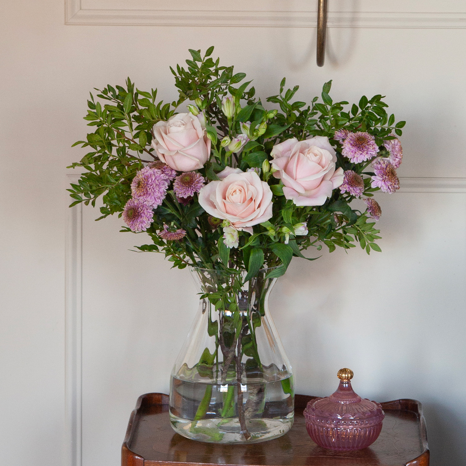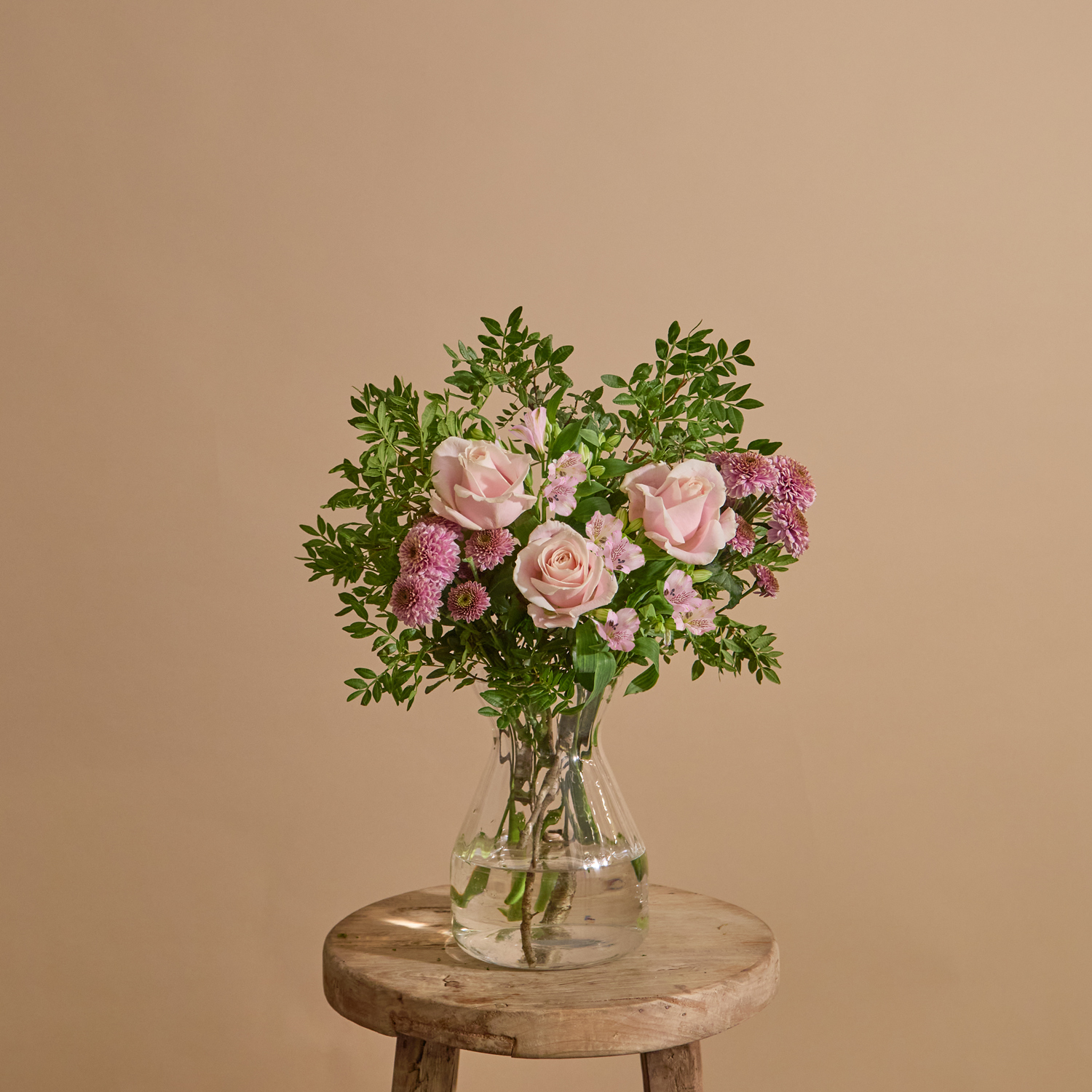 Beautiful, hand-picked, unique and unusual fresh flowers delivered direct tomorrow (next day) or set date (free). We even deliver on Sunday. Order before 8pm for your flowers to arrive tomorrow, or choose a set date. Available as as a subscription gift too. Amazing 5* reviews and 1,000s of happy customers. A symphony of pink santini and alstroemeria harmonising with Sweet Avalanche roses and lush-green pistache. This arrangement captures the feeling of sitting by the window, daydreaming or writing a letter to a loved one, as the soft sounds of the world unfurl around you.