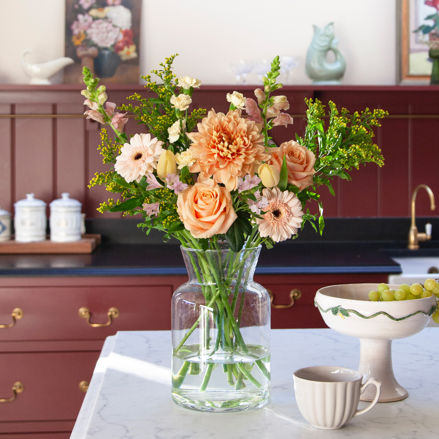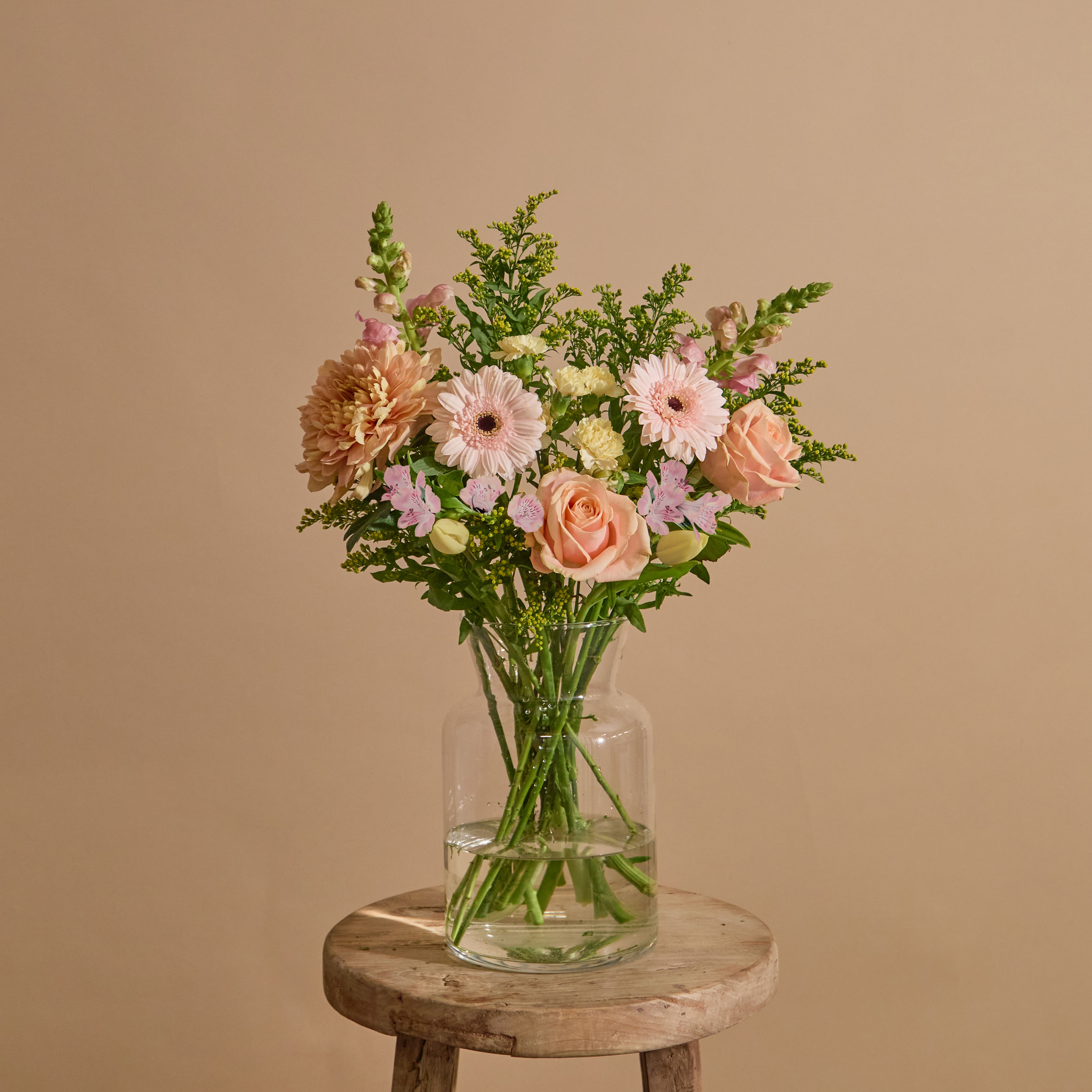 Beautiful, hand-picked, unique and unusual fresh flowers delivered direct tomorrow (next day) or set date (free). We even deliver on Sunday. Order before 8pm for your flowers to arrive tomorrow, or choose a set date. Available as as a subscription gift too. Amazing 5* reviews and 1,000s of happy customers. An arrangement of peach-golden blooms evoking yellowed parchment paper that’s been bathing in the sun, filled with meaning. Like free verse flowing from your pen, salmon-coloured chrysanthemums, pink alstroemeria and snapdragons mingle with Pearl Avalanche roses, cream-coloured tulips, and lush solidago in a poetic composition of warm hues.
