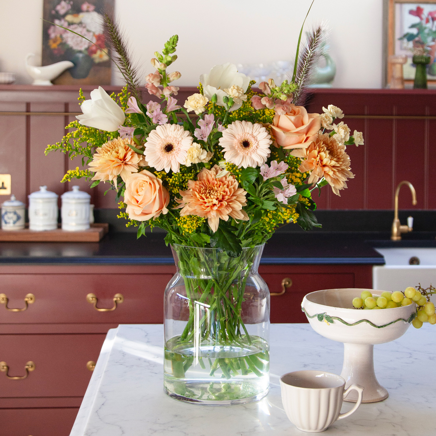 Beautiful, hand-picked, unique and unusual fresh flowers delivered direct tomorrow (next day) or set date (free). We even deliver on Sunday. Order before 8pm for your flowers to arrive tomorrow, or choose a set date. Available as as a subscription gift too. Amazing 5* reviews and 1,000s of happy customers. An arrangement of peach-golden blooms evoking yellowed parchment paper that’s been bathing in the sun, filled with meaning. Like free verse flowing from your pen, salmon-coloured chrysanthemums, pink alstroemeria and snapdragons mingle with Pearl Avalanche roses and cream-coloured tulips against a backdrop of lush solidago and pennisetum. A poetic composition of golden hues that emanates gentle warmth.