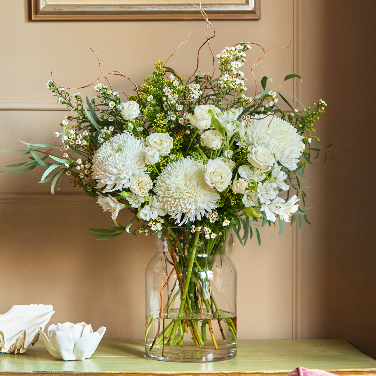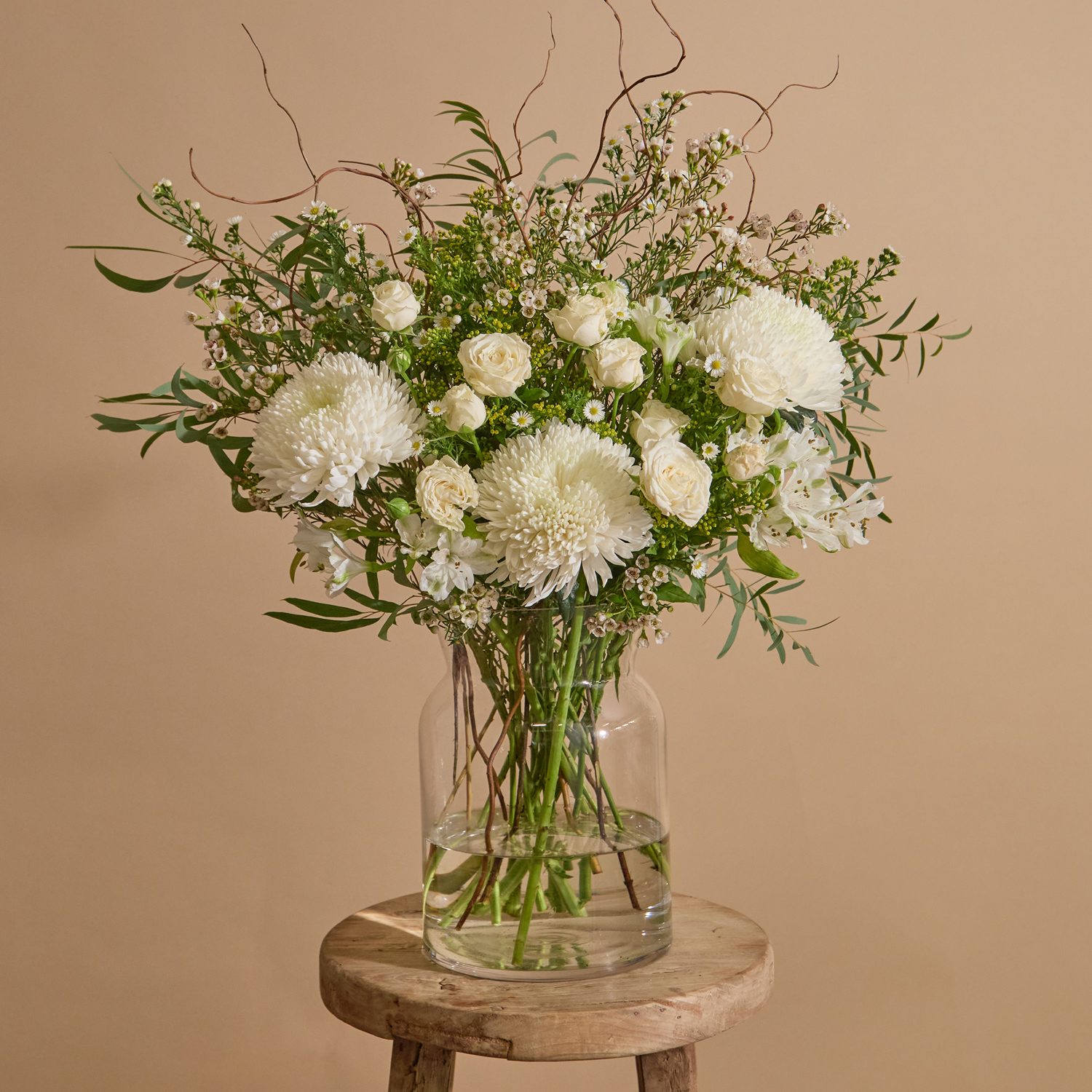 Beautiful, hand-picked, unique and unusual fresh flowers delivered direct tomorrow (next day) or set date (free). We even deliver on Sunday. Order before 8pm for your flowers to arrive tomorrow, or choose a set date. Available as as a subscription gift too. Amazing 5* reviews and 1,000s of happy customers. There is musicality in its simplicity. White chrysanthemums, spray roses, and alstroemeria create the central motif, like a line of writing that hums with clarity and sincerity. Dotted with waxflower and enveloped by a green bed of solidago, eucalyptus, and salex twisted willow with sprigs bending and bowing gracefully. This arrangement feels like reading a classic in the soft morning light or amid the glow of candles.